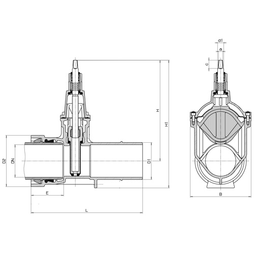 Тройник раструбный с одной встроенной клиновой Е2 — задвижкой для ПЭ (ПЭ 80/100) и ПВХ труб