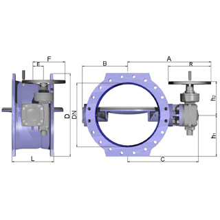 | DN | A, (мм) | B, (мм) | C, (мм) | D, (мм) | E, (мм) | F, (мм) | h1, (мм) | h2, (мм) | L, (мм) | R, (мм) | Об./длину хода | Масса, (кг) |