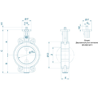 | DN, (мм) | A, (мм) | B, (мм) | C, (мм) | D, (мм) | Di, (мм) | E, (мм) | F, (мм) | Фланец | G, (мм) | H1, (мм) | H2, (мм) | Z*** | Масса, (кг) | |